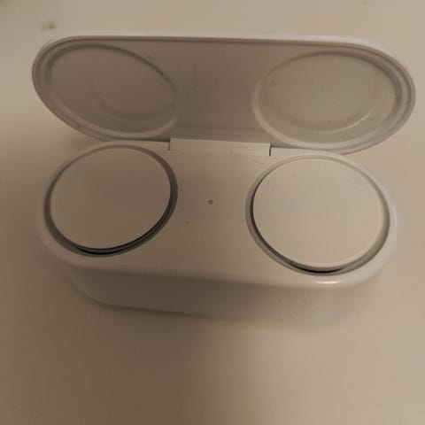 Mukaan pitäisi löytyä vielä alkuperäinen kanto/säilytyskotelo. Lataus normaalilla USB-C johdolla, tätä ei tule mukana.