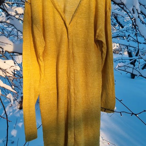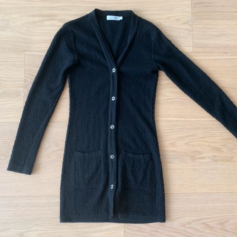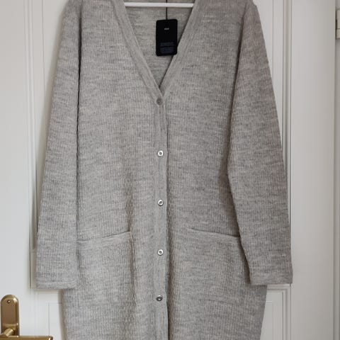 Drops Alpacasta neulottu kirjoneuletakki. Takki on leikattu auki ja leikkaussaumat vahvistettu.