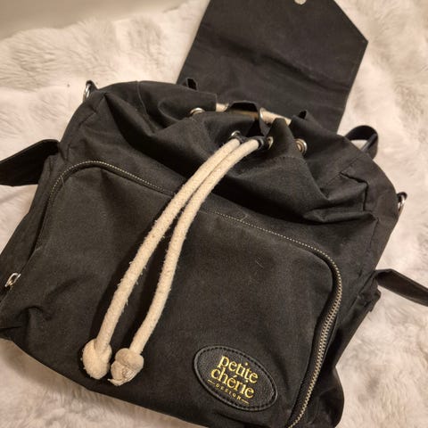 Hyväkuntoinen, monipuolinen "hoitoreppu". Pientä korjaustarvetta olkainten kiinnityskohdassa, ja jos laukku tulee liian täyteen niin vetoketju ei pysy kiinni (ongelma vain jos venyy liikaa). Mukaan kosteusalusta vaipan vaihtoon (käyttämätön meillä).