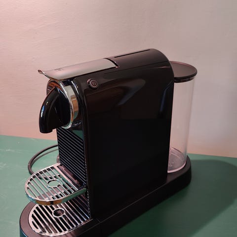 Nespresso kapselikonemusta. Kompakti kapselikone, jossa on irrotettava vesitankki ja yksinkertainen käyttöliittymä. Sopii kotikäyttöön.