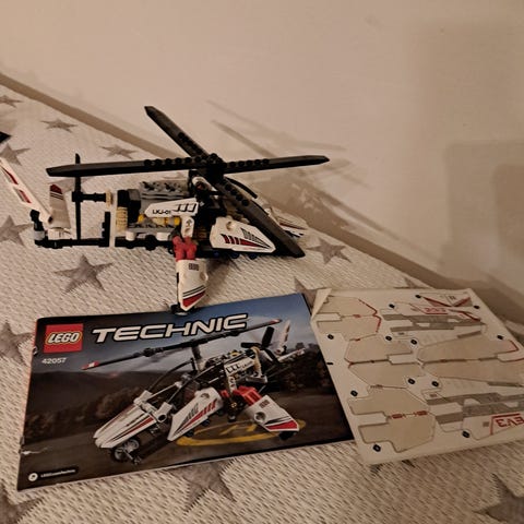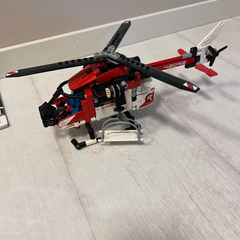 LEGO Technic helikopteri, joka koostuu useista teknisistä osista. Mallissa on musta, valkoinen ja punainen väritys. Rakennuspaketti sisältää ohjeet ja osat helikopterin kokoamiseen. Samoilla osilla saa myös koottua toisen ohjekirjan mukaisen laitteen.