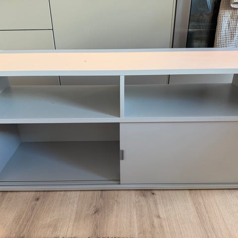 Ikeasta ostettu spiksmed TV-taso. Vaaleanharmaa sävy. Päällä vähän jälkiä näkyy kuvissa ja yksi ovi väärinpäin mutta ei vaikuta toimintaan mitenkään. Jäänyt ylimääräiseksi muuton jälkeen. Vain nouto.