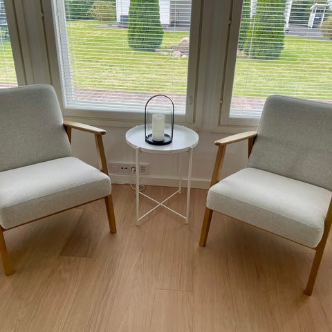 Meillä vierashuonekäytössä ollut nojatuoli. Päällinen uusittu vuosi sitten ja pesty ihan äsken. Kissa ja Koiratalous mutta nelijalkaiset eivät ole päässeet vierashuoneeseen.