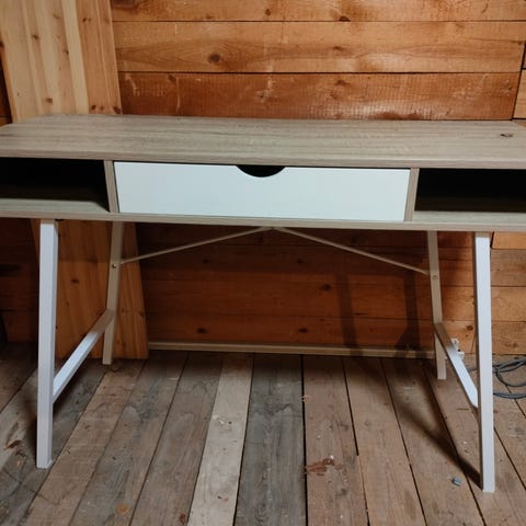 Myynnissä Jyskistä ostettu työpöytä (ABBETVED). Myynnissä on myös pöytään sopiva valkoinen tuoli, mutta ilmoituksessa vain pöydän hinta.