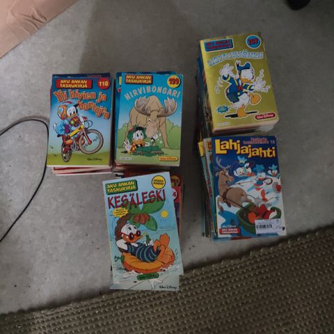 Eri sarjanumeroisia Aku Ankan taskukirjoja sekä muita julkaisuja.