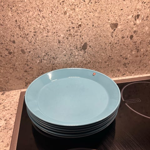 Iittalan Teema-lautaset 26cm halkaisijalla. Väri helmenharmaa. Lautasissa on normaalia käytön jälkeä ja yhdessä lautasista pieni pala lähtenyt kulmasta, kts. kuva.