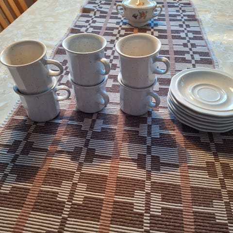 KUNTOLUOKKA 1B oleva Pentik valkoinen kahvikuppi ja lautanen. Design Peter Winquist. V. 1984-1987. Kork. 59 mm (kuppi), 19 mm (aluslautanen) Halk. 85 mm (kuppi), 144 mm (aluslautanen).