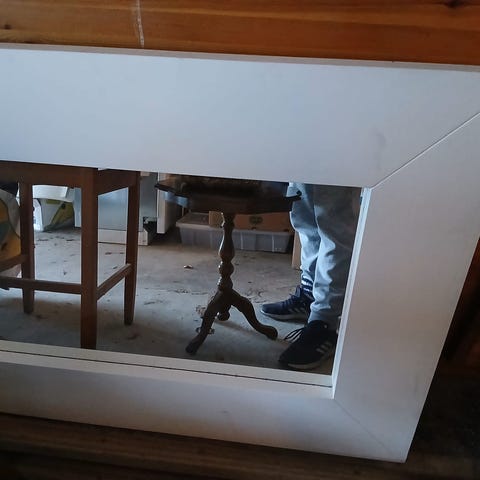 Annetaan tutun puolesta pyörivä peilikaappi. Peilikaapin pohjassa kuulat, jotka todennäköisesti pois paikaltaan ja siksi kaappi ei pyöri. Mahdollsiesti korjattavissa, ei olla itse kokeiltu korjata. Toinen kahva on irti, mutta tallessa. Ruuveja ei ole kahvaan tallessa.