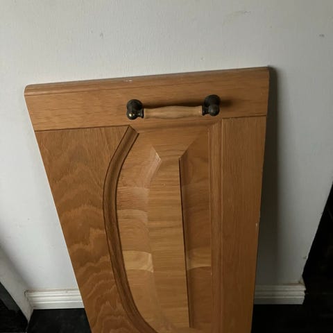 Puinen kaapinovi. Oven pinnassa on näkyvissä käytön jälkiä.