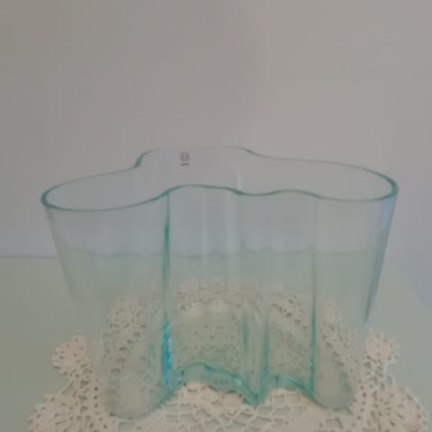Iittala Aalto maljakko vihreää lasia. Tunnettu aaltoilevasta, orgaanisesta muotoilustaan, joka sopii kukkien esillepanoon ja sisustuselementiksi.