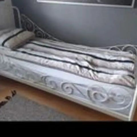 Kaunis metallisänky puusälepohjalla. Leveys 90 cm pituus 2 m. Ei patjaa.