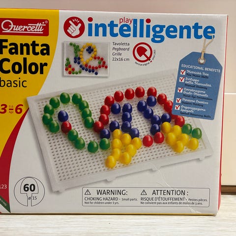 "Quercetti Play Bio Fanta Color Baby. Täydennä mosaiikkikuvat värikkäillä napeilla. Opettavainen lelu taaperolle ja leikki-ikäiselle. 6 kuvaa, 21 värikästä nappia ja pelilauta. Ikäsuositus: 1-4-vuotiaille.