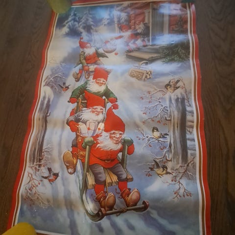 Joulutaulu, retro, mummolan tyhjennyksestä. Puurimojen välissä kaunis kankainen kuva. Olisiko väriä lähtenyt rimasta kastuessa yhteen kohtaan ja toisessa jokin musta viiru. En ole koettanut puhdistaa.