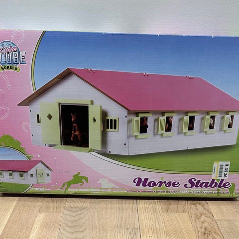 Hieno täysin kunnossa oleva hevostalli esimerkiksi Schleich-hevosille. Pituus 60cm, keveys 35 cm ja korkeus 40cm. Kovaa muovia, helppo purkaa ja kasata uudelleen. Mukaan kuvassa näkyvät tarvikkeet ja aitaustarvikkeita.