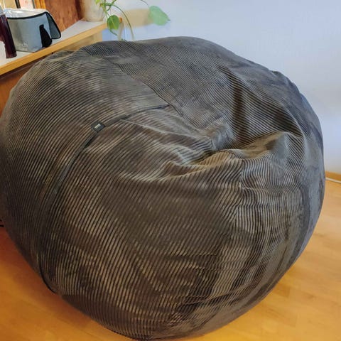Harmaalla velour kankaalla päälystetty iso premium laatuinen säkkituoli. Tämä on ihan eri tuote kuin muovipintaiset Fatboyt ja muut. Tässä on mukava pehmeä kangas ja koko riittää aikuisellekin mukavaan löhöilyyn ja päiväunia varten.