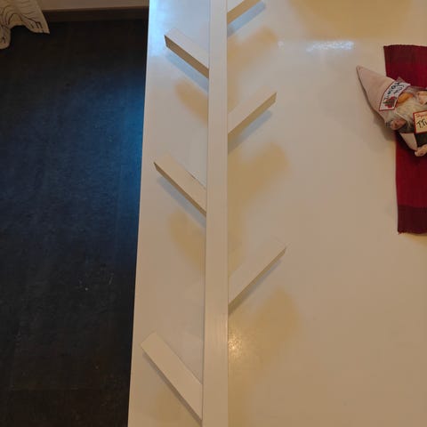 Siisti ja hyväkuntoinen valkoinen puinen naulakko, jossa metallikoukut (5 kpl). Kiinnitysruuvit mukaan.