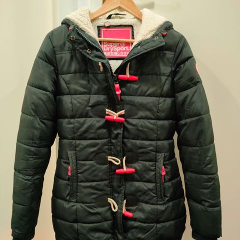 Kiva lämmin talvitakki. Karvahuppu, etutaskut, vyötärön säätömahdollisuus. Kaikki ehjää ja ei ole paljoa käytetty.