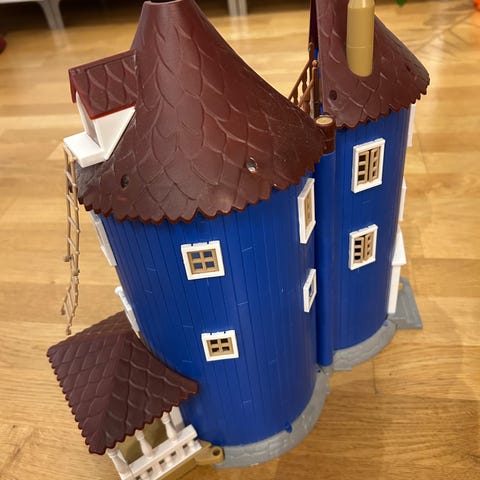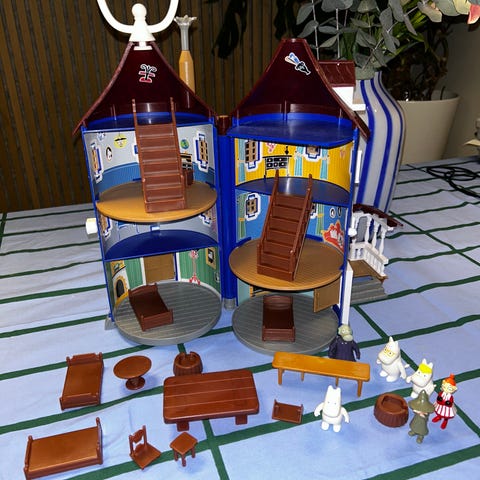 Uuden veroisessa kunnossa oleva Muumitalo tarvikkeineen. Mm. astiat edelleen alkuperäisessä pakkauksessa arvaamattomana.