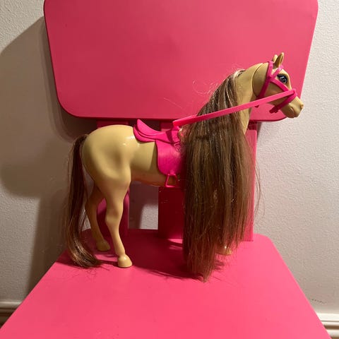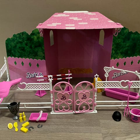 Barbie hevostalli leikkisetti sisältää tallirakennuksen, portit ja erilaisia hevosiin liittyviä leluosia kuten hevosia, vesiämpärin ja esteen. Leikkisetti on muovista valmistettu ja suunniteltu lasten leluksi. Pien tavara kuten hevoset, talikko ym. eivät ole Barbie tuotemerkin vaan muitten lastenlelujen valmistajan tuotteita. Käytönjälkeä on, talli 90 luvulta oheistavarat uudempia.