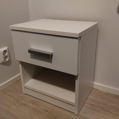 Kaksi valkoista yöpöytää. Normaalia kulumaa. Laatikoiden sisällä jonkin verran tahraa. Ulkopinnat ok/perussiistit. 15€/kpl, eli 30€ molemmat. Myydään mieluiten settinä. Vain nouto.