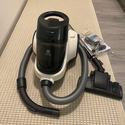 Electrolux S115 AP10 imuri, jossa mukana letku ja erilaiset suuttimet. Imuri on harmaa väriltään ja soveltuu kotitalouskäyttöön.