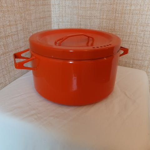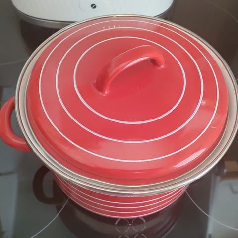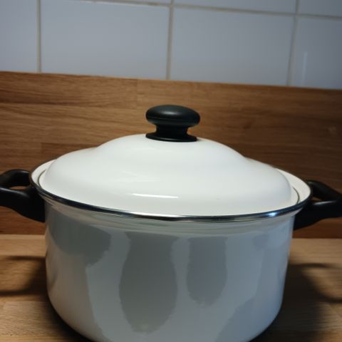 Siistikuntoinen emaloitu teräs kattila. Painava, 890g. Tilavuus 1,8 litraa piripintaan. Mitat: Suuaukon halkaisija 14,5cm, pohjan 16cm ja korkeus ilman kantta 8cm.