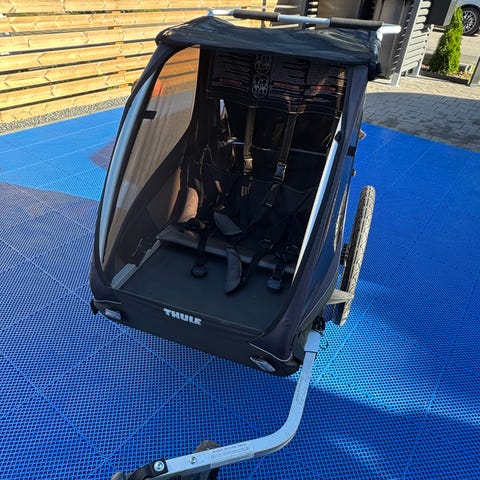 Thule Coaster XT lastenkuljetuskärry kahdelle lapselle. Pyöräkärryn lisäksi voi käyttää myös lastenrattaina. Istuimien takaa löytyy säilytystilaa tavaroiden kuljettamiseen. Saa taitettua helposti säilytystä tai kuljetusta varten.