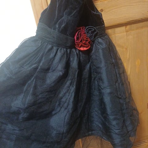 Hyväkuntoinen pari kertaa käytetty KidsOnly tummansininen mekko. Mekossa on sivuilla punainen ja kultainen raita ja nappi yksityiskohtana niskassa.