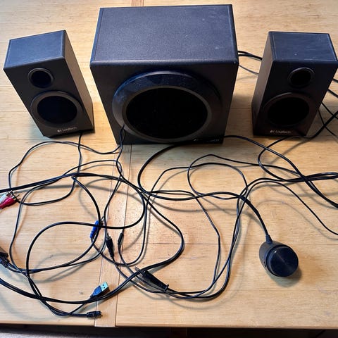 Logitech kaiutinjärjestelmä sisältää subwooferin ja kaksi satelliittikaiutinta. Kaiuttimet ovat mustia ja sopivat monipuoliseen äänentoistoon eri tiloissa.