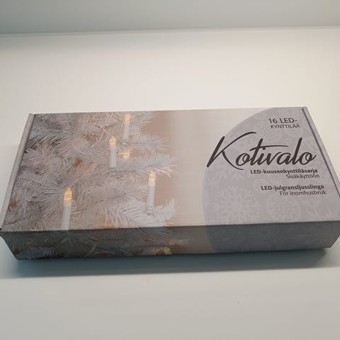 Kuusen kynttilät. 16 led kynttilää . Ehjä, 2v vanha. Kotikulta merkkinen. Kauniissa Kotikulta-kuusenvalosarjassa on 16 kynttilää. Muuntaja IP44 31V 3,6VA, virtajohdon pituus 3 m, kynttilä nauhan pituus 7,5m. kynttilöiden väli 50 cm.