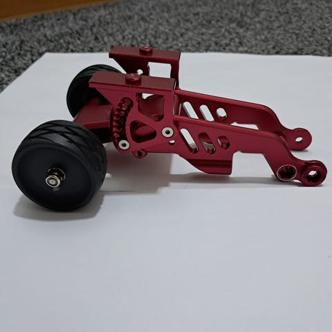 Todella järeä ja kestävä wheelie bar /siipiteline 1/8 Kraton ja muut samaa kokoa olevat rungot. Tätä wheelie baria et saa isoillakaan hypyillä rikki. Jousitettu runko. Renkaat tulee reilusti siiven takapuolelle eli perälle tiputtaessa ei mene siipi rikki. Ollut autossa pari ajotuntia tasamaalla.