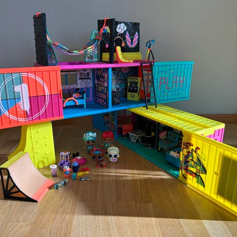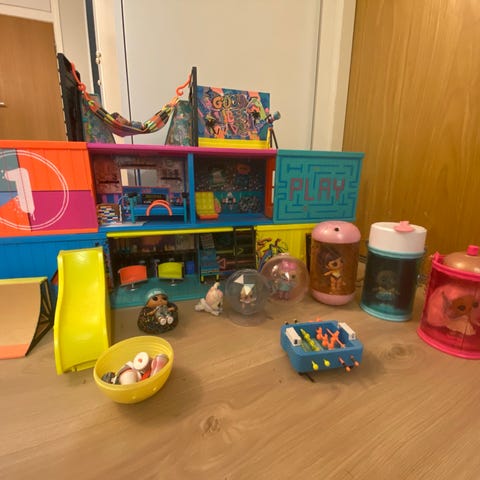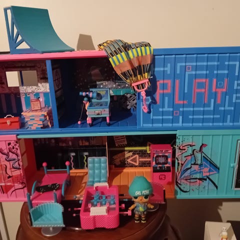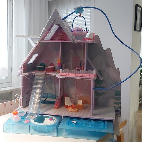 L.O.L. Surprise Winter Disco Chalet -nukkekoti. Hiihtohissi, on liimattu paikoilleen, koska irronnut, mutta toimii. Paljon erilaisia valoja ja vessanpönttö, mikä pitää vetämisen äänen. Talon takana on hiihtokeskuksen lippuluukut, joten talolla voi leikkiä molemmin päin. Tyttären suosikki!