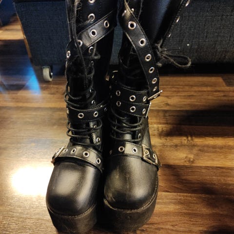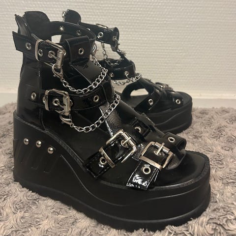 Goottihenkiset vuorettomat kengät koko 42, käyttämättömät. "Metalliosat" metallinväristä muovia.