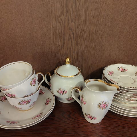 4 hengen, löytyy 4kpl kultareunuksisia kahvikuppi, kahvilautanen ja leipä lautanen. Löytyy sokeri kippo mutta ilman kantta. Kunto hyvä mutta pientä kulumaa saattaa reunoilla olla, eivät ole virheettömät.