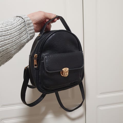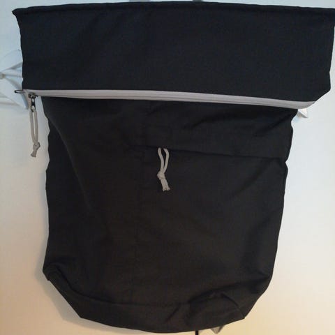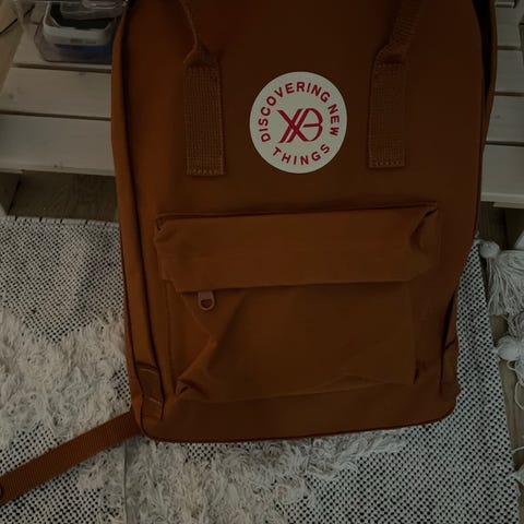 Beige-musta yliolanreppu. Eturinkassa tasku tarralla. Repun päällä pikkutasku vetoketjulla. Vain nouto.