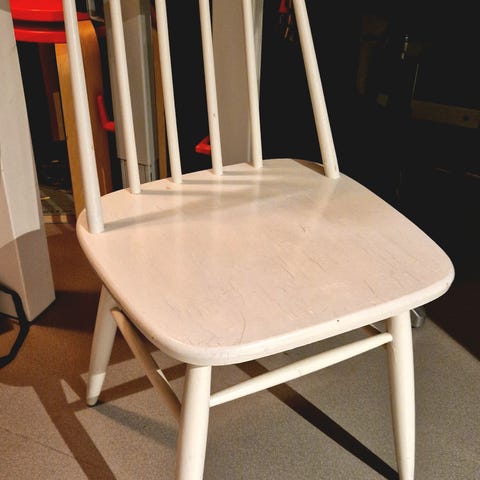 Tukeva pimnatuoli mutta maalipinta kulunut. Alla valkoinen maali, maalattu mustalla