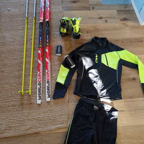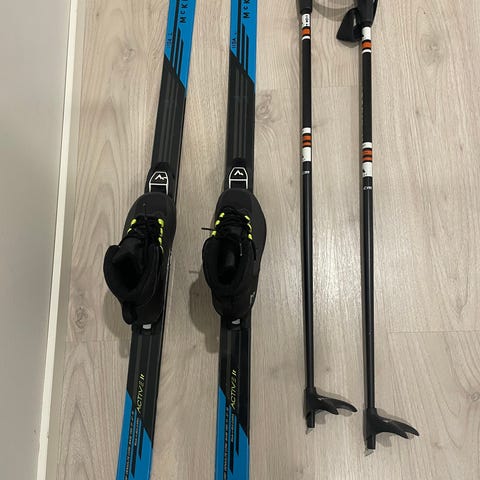 Vain kouluhiihdot hiihdetty suksipaketti. Sukset 160cm, sauvat 130cm ja monot reilu 37.