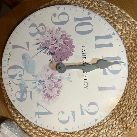 Vaaleansininen Laura Ashley -pöytäkello, jonka korkeus on 17,5 cm, leveys noin 10 cm.