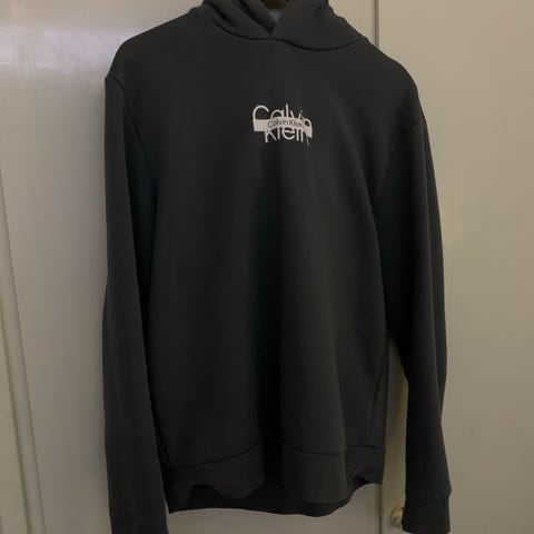 Calvin Klein Jeans huppari, koko M. Unisex malli. Väri vaaleanharmaa, materiaali puuvilla. Hupparissa on säädettävä huppu ja etutasku(läpi auki).