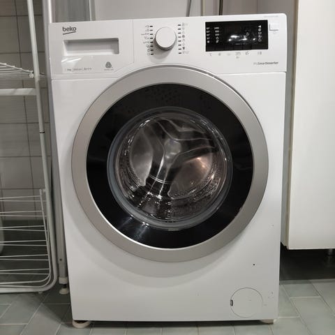 Erittäin hyväkuntoinen, vähällä käytöllä ollut ja nyt tarpeettomaksi jäänyt pyykinpesukone. Kannessa pienet tahrat hiusväristä, näkyvät yhdessä kuvassa.
