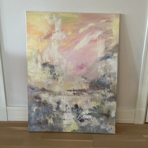 Abstrakti taulu, jonka koko on 90x90 cm. Taulun värimaailma koostuu vaaleanpunaisesta ja harmaasta. Pinta on rosoinen ja hopea hile kimaltaa auringonvalossa. Lisäkuvia pyydettäessä