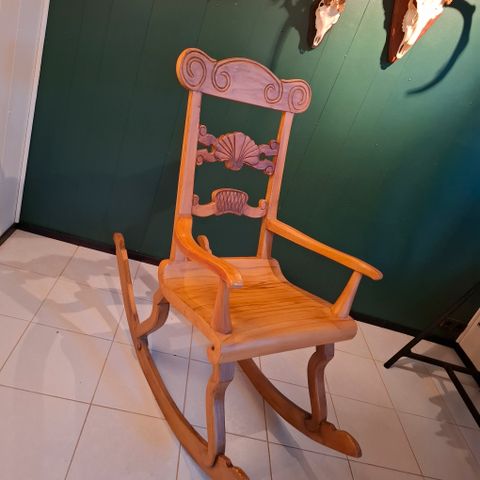 Tähän tuoliin mahtuu isompikin pukki levähtämään ja keinuen ihmetellä maailman menoa. istuinkansi yhtenäinen puu on hieman halkeillut, mutta minkäänlaista nitinää tai narinaa ei ole havaittavissa. Maalipinta ei aivan täydellinen, mutta sitä jouluisampi.