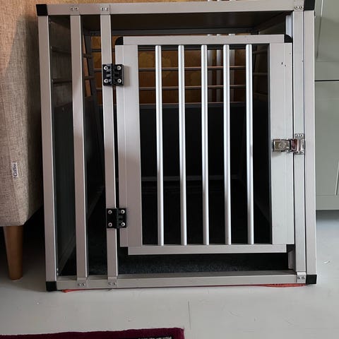 Koiran kuljetukseen tosi siisti, teräksinen häkki, jossa keskikokoinen koira mahtuu istumaan ja makaamaan. Sopi auton takakonttiin. Helposti salvalla lukittava luukku. Tyhjänä menee nopeasti litteäksi kasaan, joten näppärä.