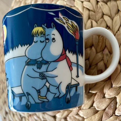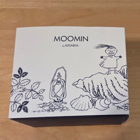 Vitriinissä vain pölyttynyt käyttämätön Merituuli -muumimuki, tarra paikoillaan.