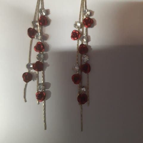 Kauniit hopeanväriset pisaranmuotoiset korvakorut Rubiininpunaiset kivet ja kimaltelevia pieniä zirkoneita hopeanvärisessä yläosassa pituus 38 mm nasta malli korvakorut in käyttämättömät korupussi tulee mukaan kulkeutuu sovittaessa lähialueelle + postitus yht 17 €