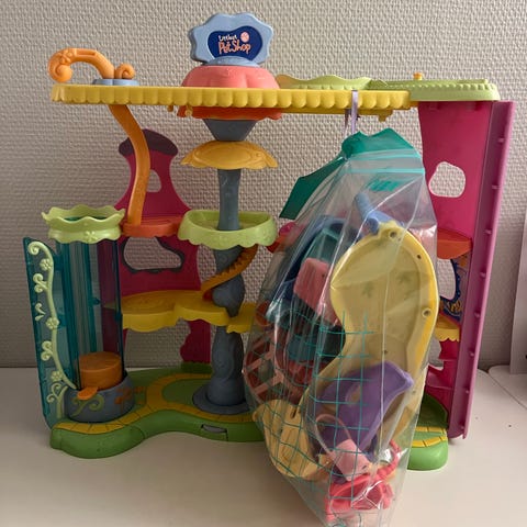 Littlest Pet Shop leikkitalo lelu (vm 2009), jossa on vihreä ja vaaleanpunainen runko. Leikkitalo sisältää taustakuvia, jotka kuvaavat rantamaisemaa ja metsää. Napista painamalla saa valon. Sopii lasten leikkeihin.