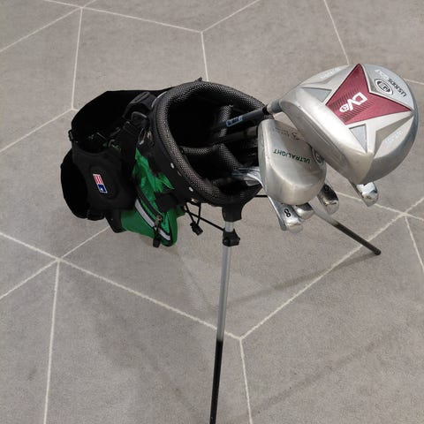 5 mailaa: driver, hybrid, rauta 7, pitching wedge ja putteri. Oikeakätinen.