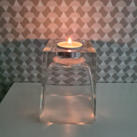 Upea lasimalja potpourrille tai tuikuille. Maljassa on koristeelliset timanginauhat ja pikkuruinen pintalohkeama yläreunassa.