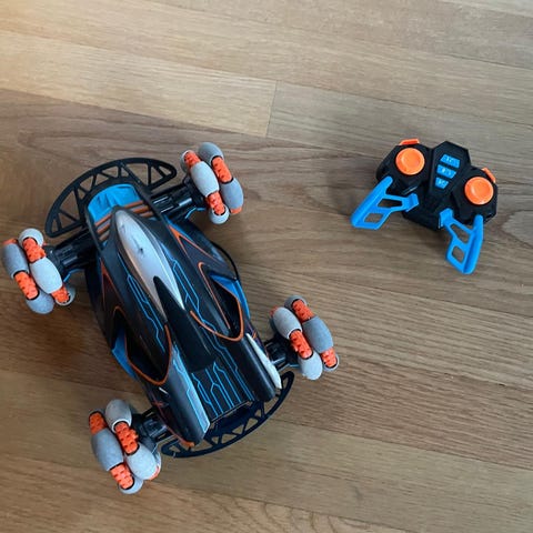 Toyota Yaris RC-auto, mukana kauko-ohjain ja neljä irrotettavaa rengasta. Auto on pienoismalli Rovanperän autosta. Auto toimii, kun vain laittaa paristot. Keula on saanut osumaa joka on korjattu teipillä, näkyy kuvassa.