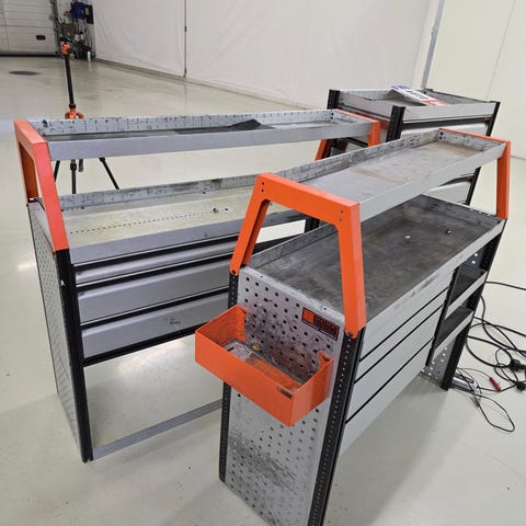 Metallinen työkaluhylly, jossa on kaksi hyllytasoa ja useita pieniä muovilaatikoita säilytystarvikkeille. Hyllyn kehys on valmistettu metallista ja siinä on siniset kahvat molemmissa päissä. Sopii työkalujen ja pienten osien järjestämiseen pakettiautossa. 1250 x 400 x 1150. Nouto Vantaa Tikkurila
